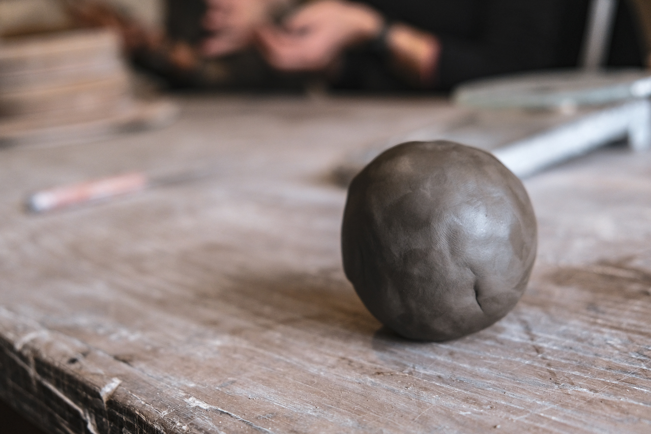 Gwen accueille jusqu’à 6 personnes dans ses ateliers. On débute directement par la découpe de notre base de terre de grès qui servira à notre création. Une petite masse qui se transformera avec nos seules mains, avec la méthode du bol pincé. Sur un autre type d’atelier Gwen propose une initiation au tour de poterie, plus connu.